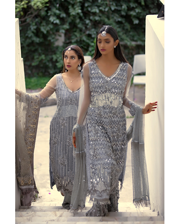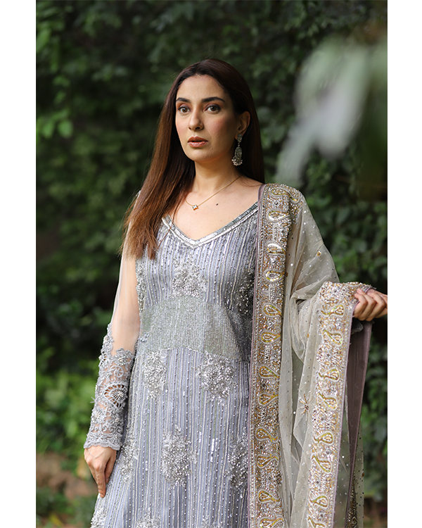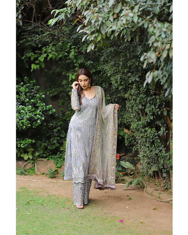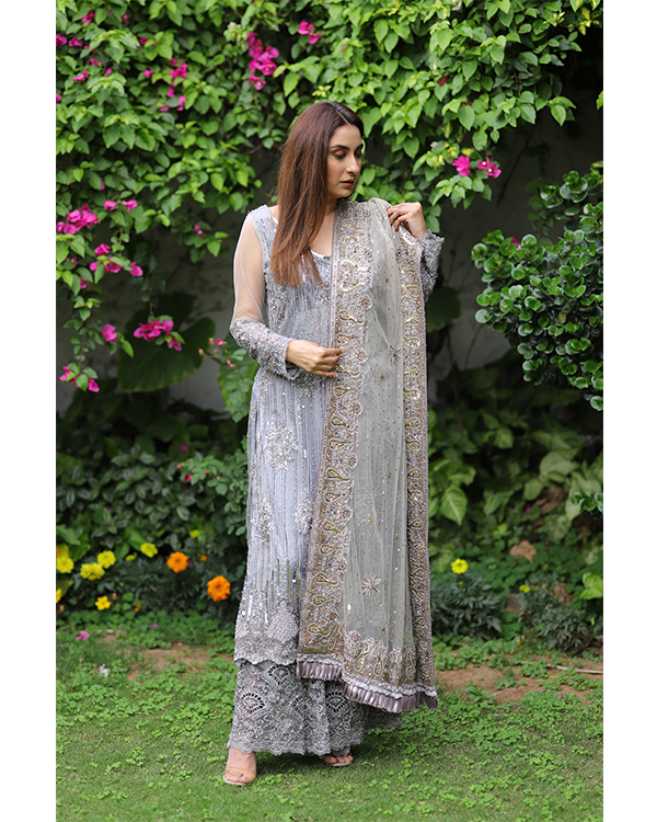 Heavily Embellished silver net long shirt with sharara pants and duppata