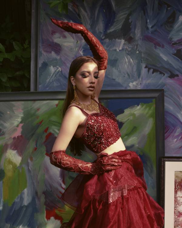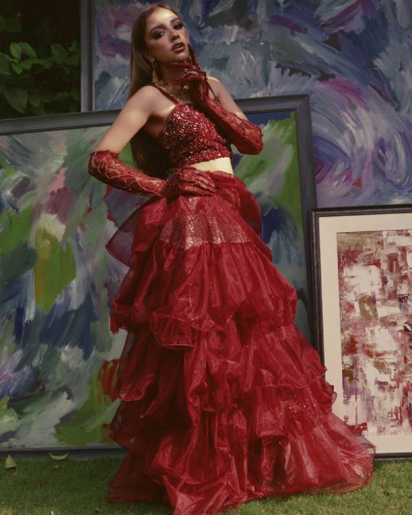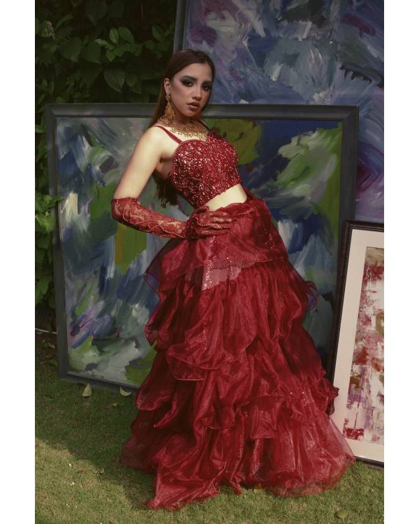 Deep burgundy heavily embellished net choli paired with organza ruffles lehnga having 3 layers and hand gloves