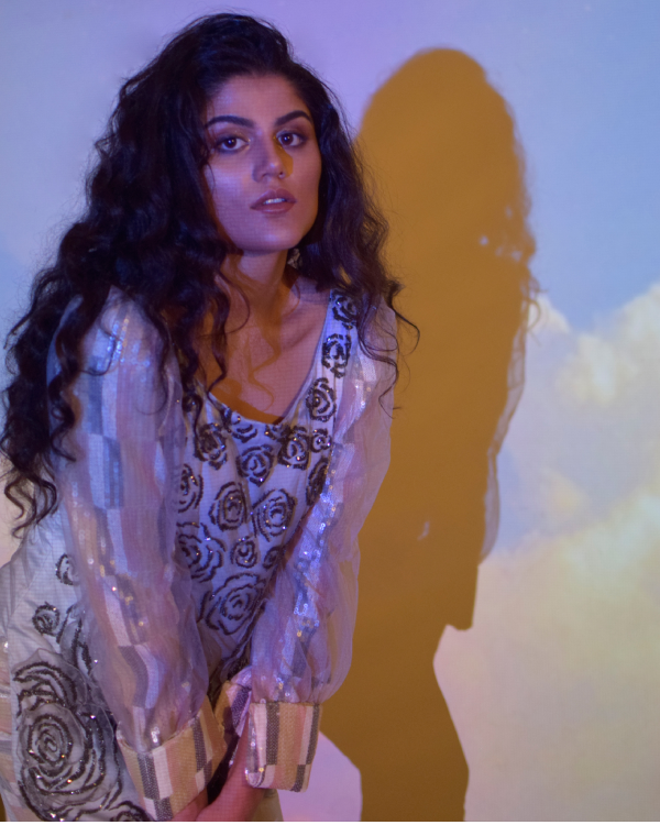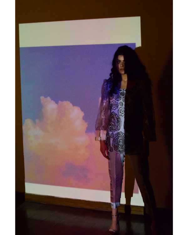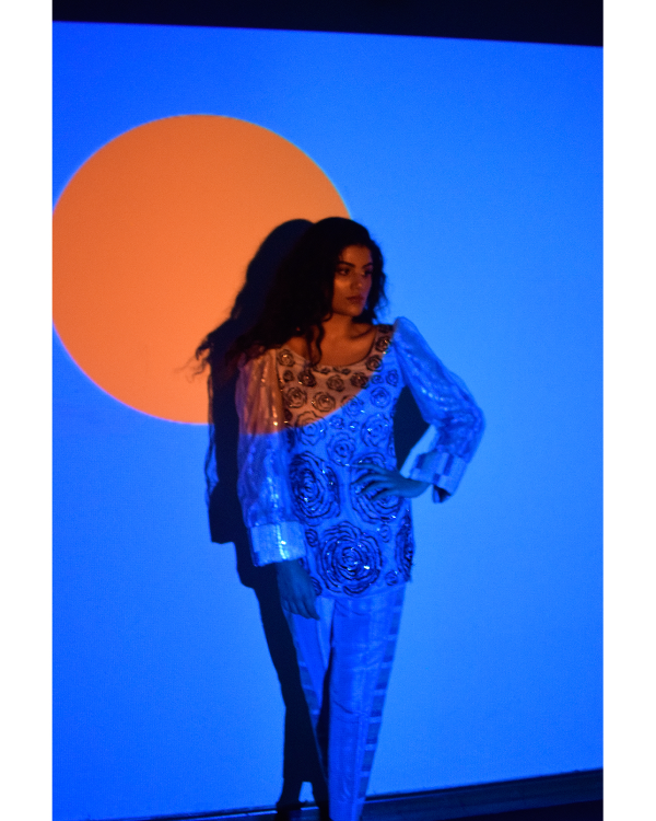 Embellished grey net shirt with organza frills , double layered sleeves of organza with taxido cuff underneath sequin fabric as lining paired with silk pants and lazercut organza dupatta